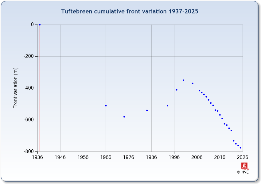 Tuftebreen is a south-facing outlet from the ice cap Jostedalsbreen draining towards Krundalen. Front position measurements started in 2007. The record is extended backwards to 1937 using airel photos, orthophotos and maps. A central flowline defines the change between the different terminus positions 1937-2004.