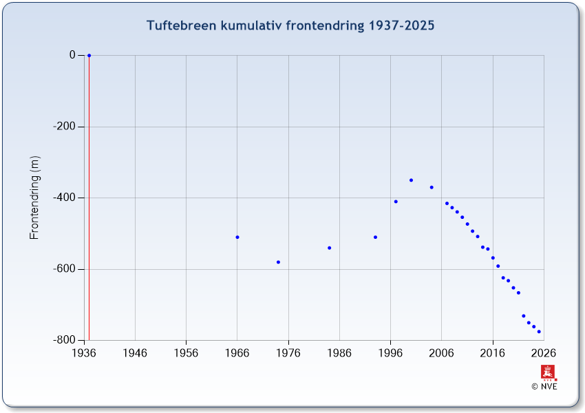 | År | Frontendring (m) | Kumulativ frontendring (m) |