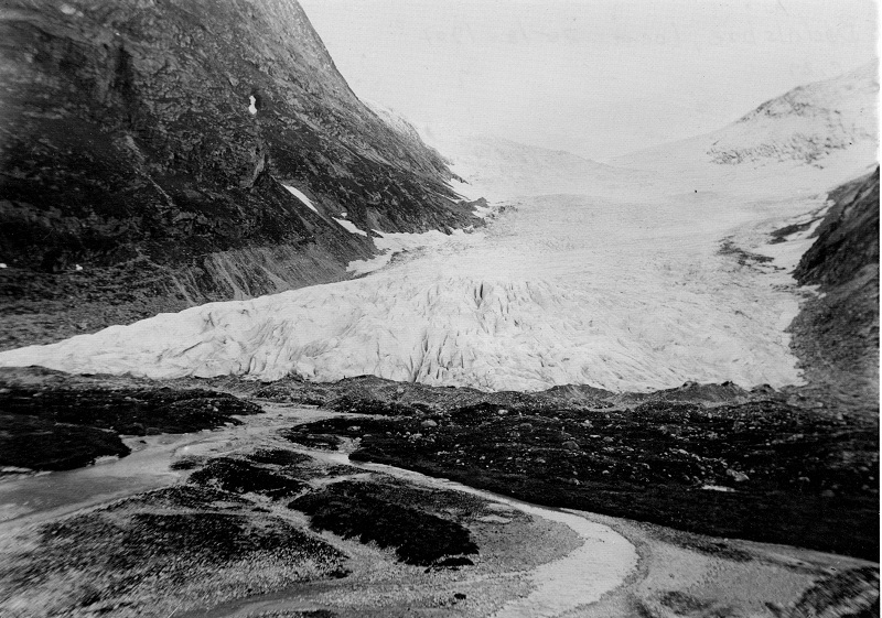 Bødalsbreen in 1871 and 2018. The glacier has retreated 500 m between 1996 and 2018. Photos: Norwegian Glacier Museum and Stefan Winkler