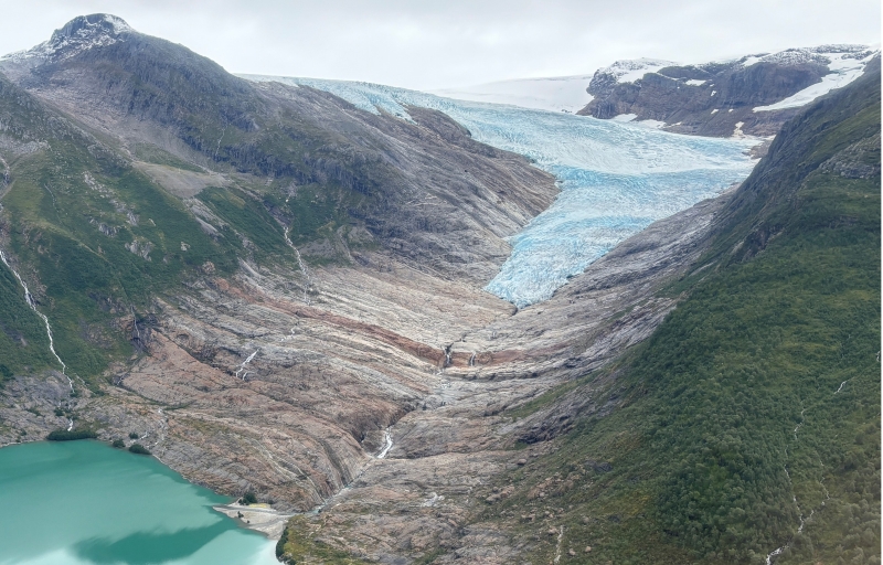 Engabreen i 1911 og 2017. Breen har smeltet tilbake 2.4 km mellom bildene og Engabrevatnet har blitt dannet. Foto: John Bernhard Rekstad og Jostein Aasen