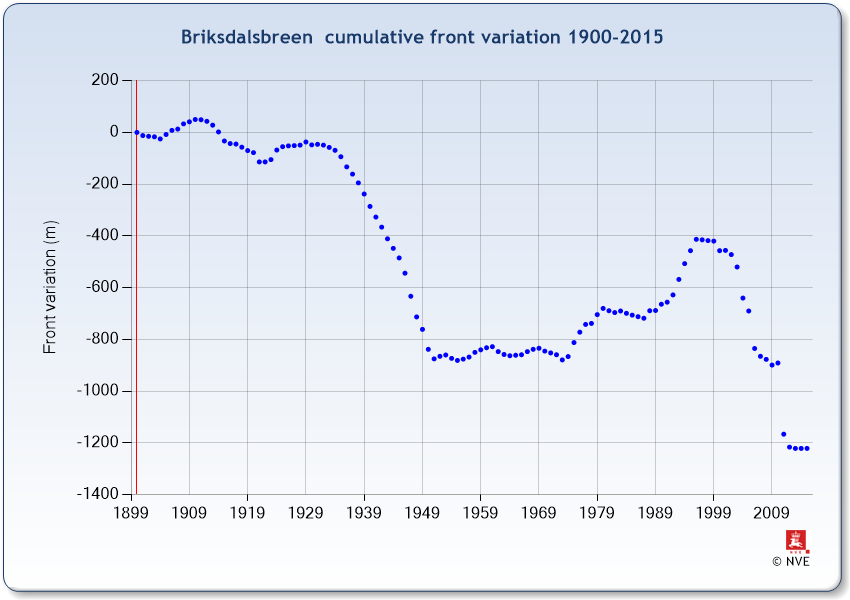 Briksdalsbreen is a western outlet glacier from Jostedalsbreen. The length change observations were terminated in 2015.