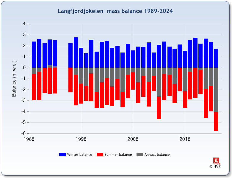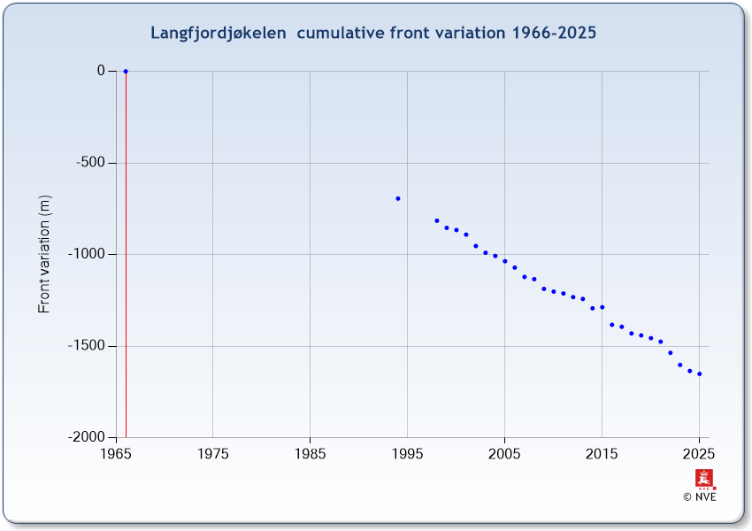 Langfjordjøkelen is a plateau glacier in Troms og Finnmark. Mass balance has been measured on the east-facing outlet since 1989 (except 1994 and 1995). Length change measurements started in 1998. The serie was extended using maps from 1966 and 1994.