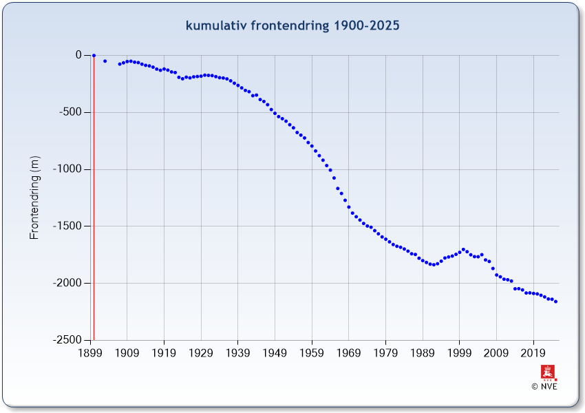 | År | Frontendring (m) | Kumulativ frontendring (m) |