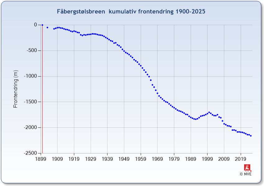 Fåbergstølsbreen er en utløper fra Jostedalsbreen. 2019: Frontposisjonendringane mellom 1936 og 1972 og mellom 1984 og 1999 er justert basert på kartlagte frontposisjonar.