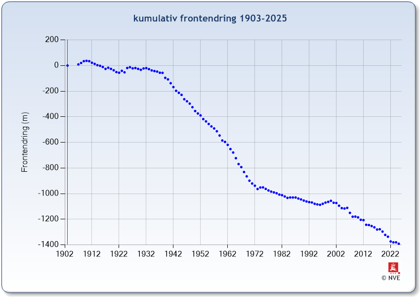 | År | Frontendring (m) | Kumulativ frontendring (m) |