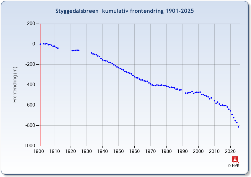 | År | Frontendring (m) | Kumulativ frontendring (m) |