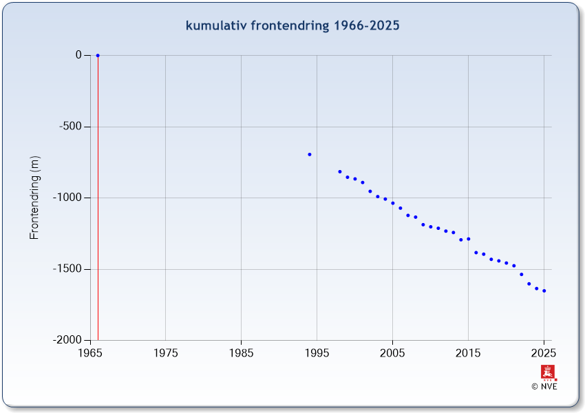 Klikk her for mer informasjon om breen.| År | Frontendring (m) | Kumulativ frontendring (m) |